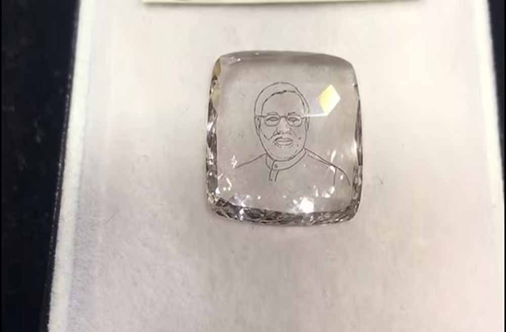 गुजरात के सूरत में हीरा बनाने वाली कंपनी के कारीगरों ने बड़ा कमाल कर दिखाया है। उन्होंने 8 कैरेट के हीरे पर प्रधानमंत्री नरेंद्र मोदी की छवि उकेरी है। यह आभूषण शहर में एक प्रदर्शनी में प्रदर्शित किया गया है।