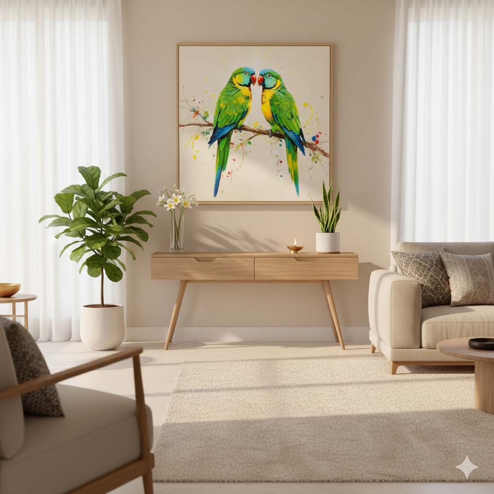 घर के ड्राइंग रूम या लिविंग एरिया में तोते की तस्वीर लगाने से घर में खुशी और सौहार्द का माहौल बनता है, परिवार के सदस्यों और मेहमानों के बीच संबंध मधुर होते हैं। रिश्तों में तनाव कम होता है क्योंकि उत्तर और पूर्व दिशाएं सकारात्मक ऊर्जा के प्रवेश द्वार मानी जाती हैं। तोते की रंगीन छवि पंचतत्वों का संतुलन करती है, जिससे घर की निराशा दूर होती है और सुख-सौभाग्य में वृद्धि होती है।