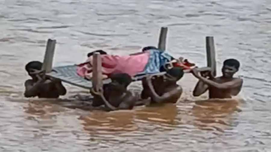 गर्भवती महिला को चारपाई में रखकर कराई नदी पार