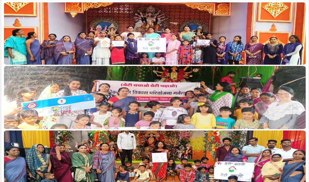 महिला एवं बाल विकास विभाग द्वारा शहर के विभिन्न दुर्गा पंडालों में नवरात्रि के पावन अवसर पर “बेटी बचाओ, बेटी पढ़ाओ“ योजना के अंतर्गत विशेष जागरूकता कार्यक्रम आयोजित किए जा रहे हैं। इन कार्यक्रमों के माध्यम से कन्या भ्रूण हत्या की रोकथाम और कन्या शिक्षा के महत्व पर जोर दिया जा रहा है। कार्यक्रमों में स्थानीय लोगों को जागरूक करने के लिए प्रेरणादायक स्लोगन और जागरूकता अभियान का आयोजन किया गया। “बेटी बचाओ, बेटी पढ़ाओ-आने वाली पीढ़ी को सशक्त बनाओ“ जैसे प्रभावशाली संदेश के साथ लोगों को यह बताया जा रहा है कि बेटियां समाज और देश का भविष्य हैं और उनके जीवन और शिक्षा की सुरक्षा करना हम सभी का कर्तव्य है।