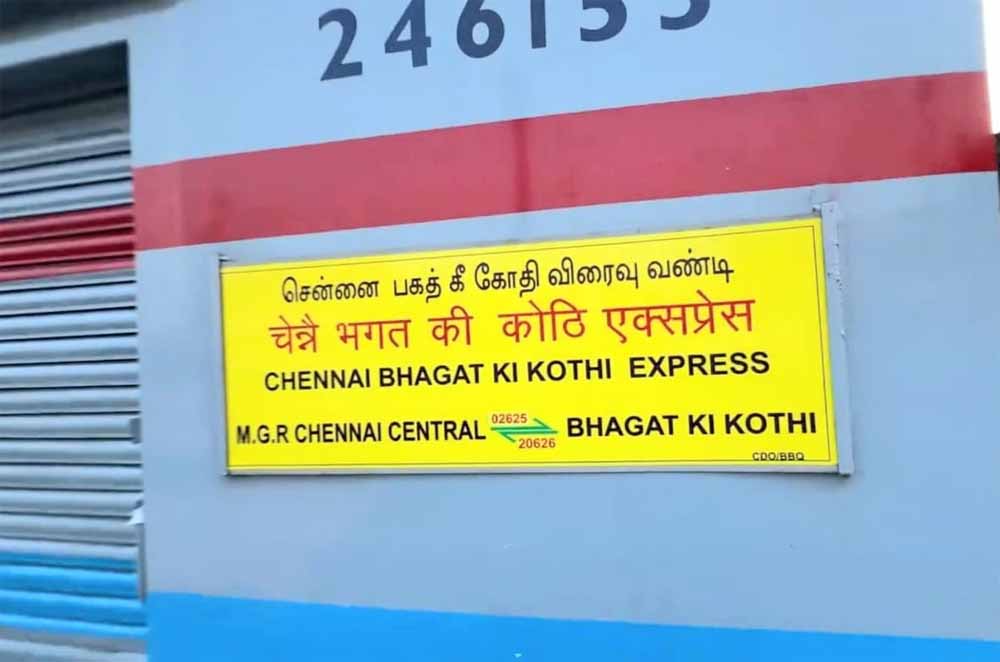 उपनगरीय भगत की कोठी से डॉ. एमजीआर चेन्नई सेंट्रल स्टेशनों के बीच प्रारंभ की गई नई सुपरफास्ट ट्रेन भगत की कोठी से आज पहली बार रवाना हुई। समदड़ी-जालोर-भीलड़ी के रास्ते चलने वाली इस ट्रेन के संचालन के प्रति दक्षिण की ओर जाने वाले यात्रियों में खासा उत्साह है। ट्रेन आवागमन में सप्ताह में पांच दिन चलेगी। इस दौरान मार्ग के 28 स्टेशनों पर ठहराव करेगी।
