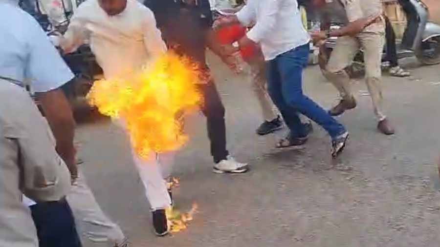 पुलिस की चौक-चौबंद व्यवस्था थी. कांग्रेस ने तयशुदा कार्यक्रम के तहत पुतला दहन करते हुए पोस्टर डाला, जिसे पुलिस को हटाने से रोकने के लिए जिला कांग्रेस अध्यक्ष दौड़े और जलते हुए पुतले की चपेट में आ गए, जिन्हें पुलिस ने पुतला बुझाने के लिए लाए गए पानी से बुझाकर अस्पताल में भर्ती कराया गया.