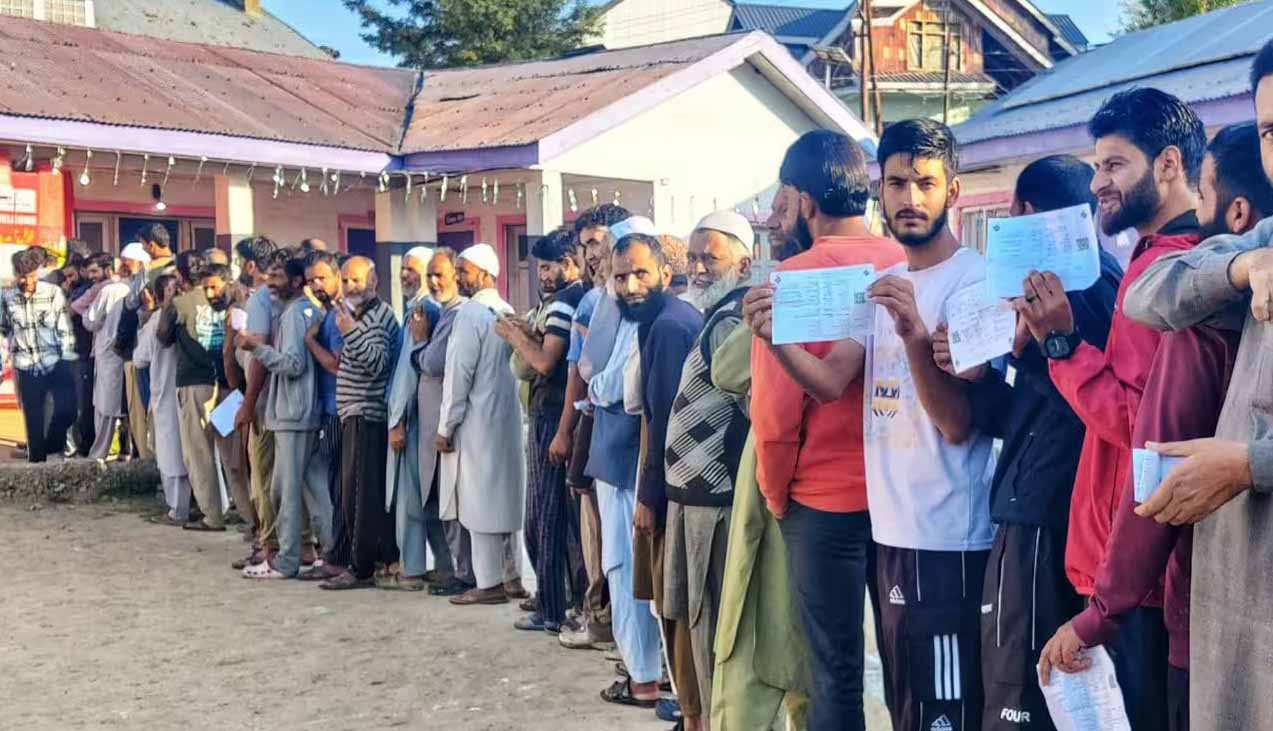 जम्मू-कश्मीर में विधानसभा चुनाव के तीसरे और अंतिम चरण के लिए आज मंगलवार को हो रहे मतदान में भारी भीड़।