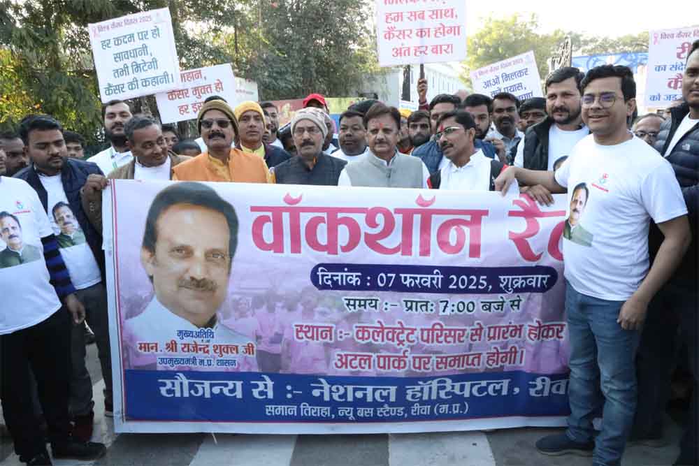 उप मुख्यमंत्री राजेन्द्र शुक्ल ने कहा कि कैंसर की समय पर पहचान समुचित उपचार के लिये महत्वपूर्ण है। केन्द्र व राज्य सरकार द्वारा कैंसर उपचार के लिये महत्वपूर्ण कदम उठाये गये हैं। शासकीय अस्पतालों के साथ ही निजी चिकित्सालय में इस बीमारी के विरूद्ध लड़ाई में सहभागी बन रहे हैं। सभी के समन्वित प्रयासों व आमजनों में जागरूकता से ही कैंसर मुक्त देश का मार्ग प्रशस्त होगा। उप मुख्यमंत्री श्री राजेन्द्र शुक्ल ने रीवा में विश्व कैंसर दिवस के उपलक्ष्य में वॉकाथन रैली को हरी झण्डी दिखाकर रवाना किया।