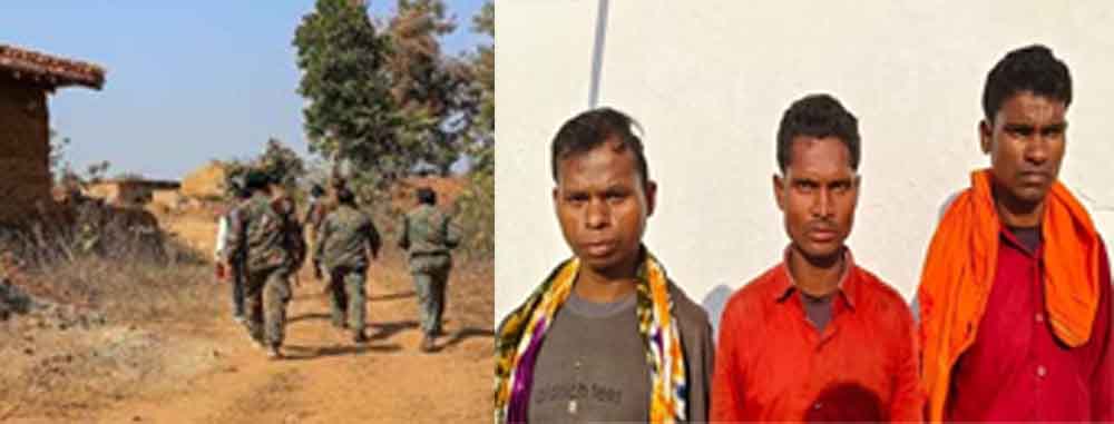 अभियान से वापसी के दौरान नैनपाल व पुलसुमपारा गंगालुर के बीच पुलिस पार्टी को देखकर छिपते हुए भाग रहे तीन संदिग्ध व्यक्ति दिखे जिन्हें घेराबंदी कर पकड़ा गया। पकड़े गए व्यक्तियों से पूछताछ करने पर अपना नाम बुधराम कोरसा पिता सुक्कू कोरसा उम्र 26 निवासी गायतापारा मुनगा, छोटू लेकाम पिता मंगू लेकाम उम्र 29 निवासी गायतापारा मुनगा व लखन कुंजाम पिता स्व. हुंगा कुंजाम उम्र 27 निवासी गायतापारा मुनगा थाना क्षेत्र गंगालुर का होना बताया। पकड़े गए नक्सलियों के कब्जे से प्रतिबंधित विस्फोटक सामग्री, टिफिन बम, कॉर्डेक्स वायर, सेफ्टी फ्यूज व प्रतिबंधित संगठन के प्रचार प्रसार की सामग्री बरामद की गई है। पकड़े गए नक्सलियों के विरुद्ध गंगालुर थाना में विस्फोटक पदार्थ अधिनियम की धाराओं में विधिक कार्यवाही के बाद न्यायिक रिमांड पर मुख्य न्यायिक मजिस्ट्रेट के न्यायालय दंतेवाड़ा के समक्ष पेश किया गया हैं।