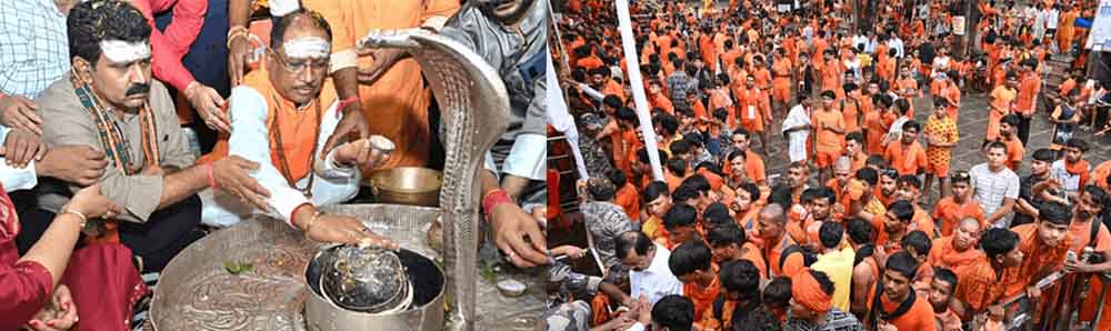 आज सोमवार को दो हेलीकॉप्टर से भोरमदेव मंदिर परिसर के आसपास कांवरियों पर पुष्प वर्षा की गई। सीएम विष्णु देव साय व डिप्टी सीएम विजय शर्मा दोनों कबीरधाम पहुंचे हैं। मुख्यमंत्री साय प्रदेश की खुशहाली और समृद्धि के लिए मंदिर में विशेष पूजा-अर्चना और अभिषेक किया। तय कार्यक्रम के मुताबिक, मुख्यमंत्री विष्णुदेव साय आज सोमवार सुबह 7.05 बजे हेलीकॉप्टर द्वारा पुलिस ग्राउंड रायपुर से प्रस्थान कर 7.35 बजे पीजी कॉलेज हेलीपेड कवर्धा पहुंचे।