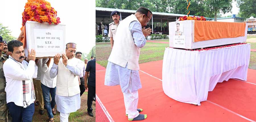मुख्यमंत्री श्री विष्णु देव साय और उपमुख्यमंत्री श्री विजय शर्मा ने आज चौथी बटालियन माना पहुंचकर गत दिवस बीजापुर जिले के तर्रेम में माओवादियों द्वारा किये आईईडी ब्लास्ट में शहीद हुए जवान श्री भरत लाल साहू के पार्थिव शरीर पर पुष्पचक्र अर्पित कर श्रद्धांजलि दी। मुख्यमंत्री और उपमुख्यमंत्री ने शहीद जवान के पार्थिव शरीर को कंधा देकर ससम्मान निवास रायपुर के सड्डू के लिए रवाना किया।