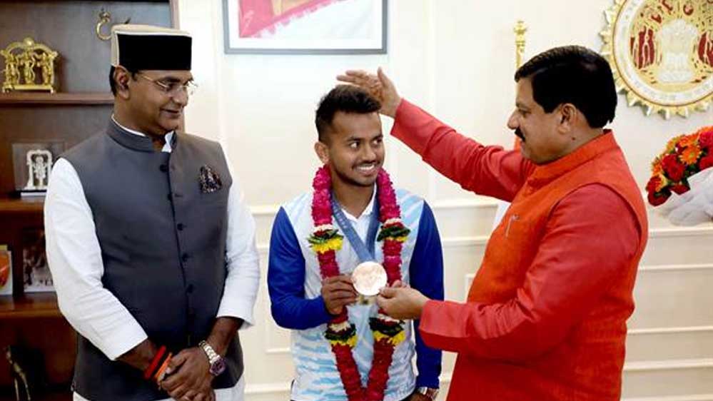 मुख्यमंत्री डॉ. यादव ने आज मुख्यमंत्री निवास में भारतीय हॉकी टीम के सदस्य प्रतिभावान खिलाड़ी और मध्यप्रदेश पुलिस में डीएसपी विवेक सागर को अंग वस्त्र और मैडल से सम्मानित किया।