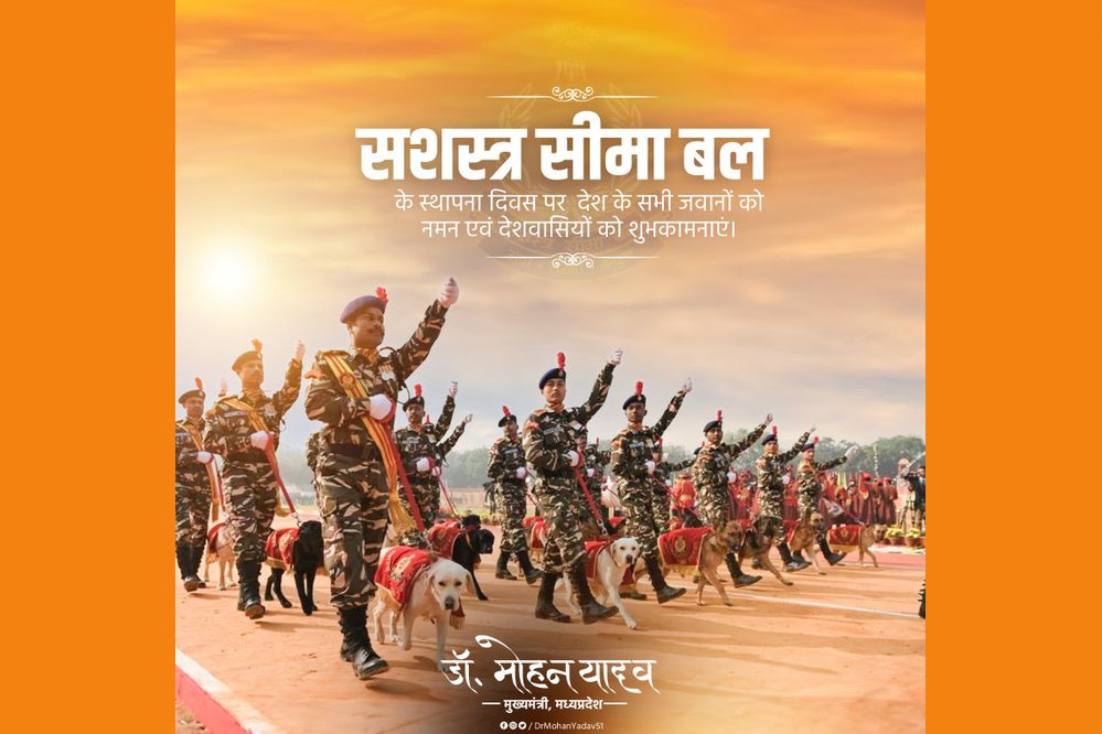 मुख्यमंत्री डॉ. मोहन यादव ने सशस्त्र सीमा बल के स्थापना दिवस की हार्दिक बधाई एवं शुभकामनाएं दी हैं। मुख्यमंत्री डॉ. यादव ने कहा कि सेवा, सुरक्षा, बंधुत्व' के ध्येय वाक्य के साथ देश की रक्षा के लिए समर्पित मां भारती के वीर सपूतों को नमन है। मुख्यमंत्री डॉ. यादव ने कहा कि देश के लिए अपने प्राणों का बलिदान देने वाले सपूतों पर राष्ट्र को गर्व है।