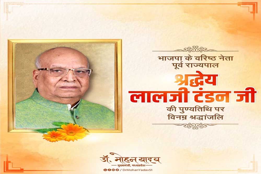 मुख्यमंत्री डॉ. मोहन यादव ने मध्यप्रदेश के पूर्व राज्यपाल श्रद्धेय लालजी टंडन 'बाबूजी' की पुण्यतिथि पर विनम्र श्रद्धांजलि अर्पित की है। मुख्यमंत्री डॉ. यादव ने कहा कि श्रद्धेय टंडन जी का संपूर्ण जीवन सेवा, संगठन और अनुशासन को समर्पित रहा, जो देशभक्ति और गरीब कल्याण के संकल्प का अनुकरणीय अध्याय है। श्री लालजी टंडन के समाज सेवा कार्यों से हम सभी को सदैव राष्ट्र के प्रति कर्तव्य बोध की प्रेरणा मिलती रहेगी।