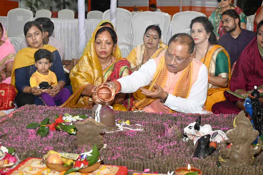 मुख्यमंत्री विष्णु देव साय अपनी पत्नी श्रीमती कौशल्या देवी साय के साथ सपरिवार आज मुख्यमंत्री निवास पर पवित्र सावन मास के अवसर पर आयोजित शिव रूद्रामहाभिषेक हवन-पूजन कार्यक्रम में शामिल हुए। उन्होंने मंत्रोच्चार और जयकारों के साथ रुद्राभिषेक करते हुए भगवान शिव की पूजा-अर्चना कर आशीर्वाद लिया एवं प्रदेशवासियों की सुख-समृद्धि एवं शांति की कामना की।