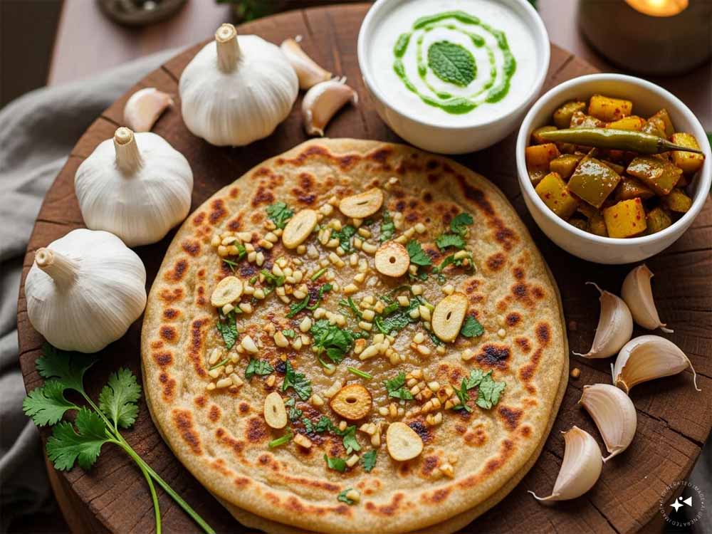 आपका गर्मागर्म चिली गार्लिक पराठा तैयार है। इसे दही, अचार या अपनी मनपसंद चटनी के साथ परोसें।