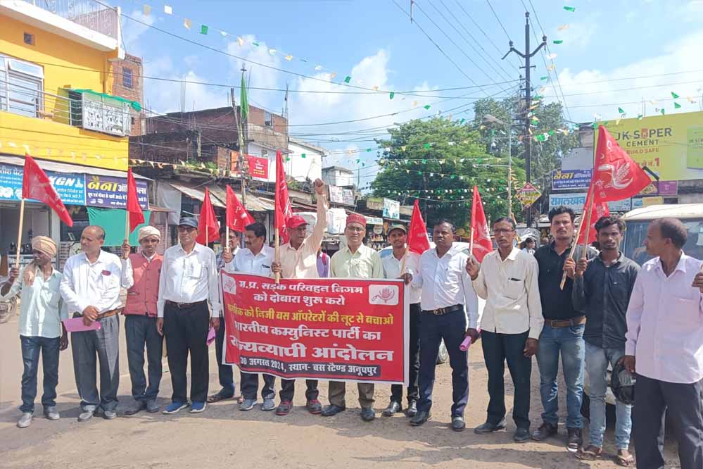 भारतीय कम्युनिस्ट पार्टी जिला अनूपपुर की ओर से अनूपपुर मुख्यालय स्थित बस स्टैंड पर एवं कोतमा एसडीएम कार्यालय के समक्ष मध्य प्रदेश राज्य परिवहन निगम चालू करने की मांग को लेकर क्रमशः कलेक्टर अनूपपुर और एसडीएम कोतमा को ज्ञापन सोपा गया भारतीय कम्युनिस्ट पार्टी ने ज्ञापन में यह उल्लेखित किया है कि समूचे मध्य प्रदेश में रेल सेवाओं के मामले में अत्यंत पिछड़ा हुआ है ।रेल विभाग ने कुछ सालों से सुनियोजित तरीके से सस्ती टिकट वाली पैसेंजर ट्रेन या तो बंद कर दी है या उन्हें महंगे किराए वाली एक्सप्रेस ट्रेन में बदल दिया है ,और एक्सप्रेस ट्रेन में जनरल और स्लीपर कोच लगातार घटाकर आम आदमी की  पहुंच से बहुत से दूर कर दिया गया है दूरस्थ ग्रामीण अंचलों में आम जनता यातायात के लिए पूरी तरह से निजी बस सेवा पर निर्भर है जिनमें मनमर्जी से किराया वसूला जाता है बसों में लोगों का जान जोखिम में है क्योंकि ना तीन गाड़ियों का कोई फिटनेस होता है और ना ही देखभाल यात्रियों को बसों में जानवरों की तरह ठूंसा जाता है और आए दिन बस दुर्घटना का शिकार होकर  यात्रियों को जान लेती रहती है ।