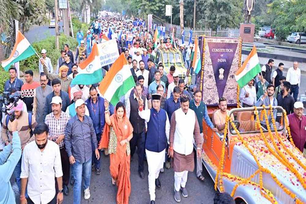 कार्यक्रम में मुख्यमंत्री डॉ. मोहन यादव का रिकार्डेड संदेश भी सुनवाया गया। साथ ही संविधान की प्रस्तावना का वाचन और राष्ट्रगान भी हुआ। पिछड़ा वर्ग एवं अल्पसंख्यक राज्यमंत्री (स्वतंत्र प्रभार) श्रीमती कृष्णा गौर, विधायक श्री रामेश्वर शर्मा और भगवानदास सबनानी भी कार्यक्रम में शामिल हुए। कार्यक्रम की शुरूआत में अतिथियों द्वारा दीप प्रज्ज्वलन कर बाबा साहेब डॉ. भीमराव अम्बेडकर, भारत माता एवं सरदार वल्लभ भाई पटेल के चित्र पर पुष्पाजंलि अर्पित की। संविधान की प्रतिकृति को नमन कर संविधान दिवस पदयात्रा की शुरूआत की गई। संविधान दिवस पदयात्रा शौर्य स्मारक से आरंभ होकर बोर्ड ऑफिस चौराहे पर अंबेडकर जी की प्रतिमा की परिक्रमा और नमन के साथ माल्यार्पण कर पुन: शौर्य स्मारक पर आगमन के साथ समाप्त हुई।