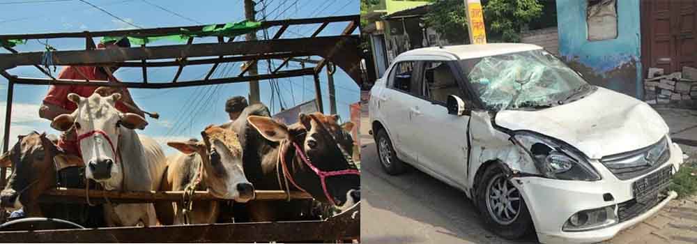 राजस्थान-भरतपुर में पुलिस से बचकर भागने में लोहे के एंगलों से टकराई गौ तस्करों की कार