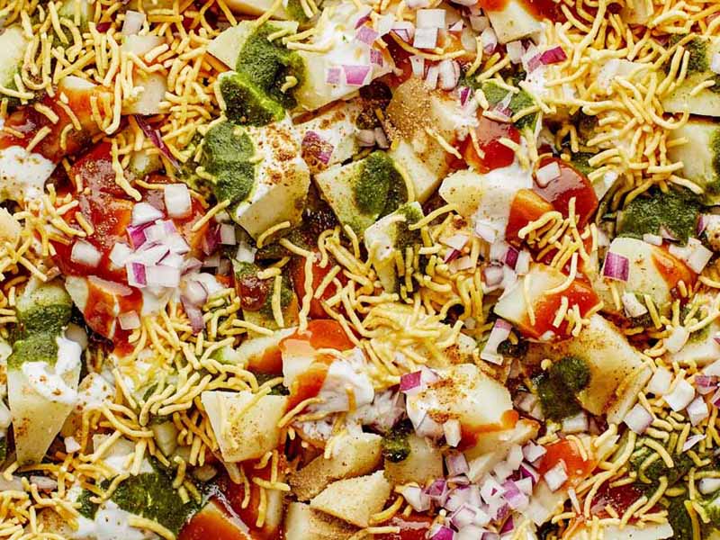 चाट को प्याले में निकाल लीजिए। अनार, धनिया पत्ती, सेव और लहसुन मेयो से गार्निश करें और परोसें।