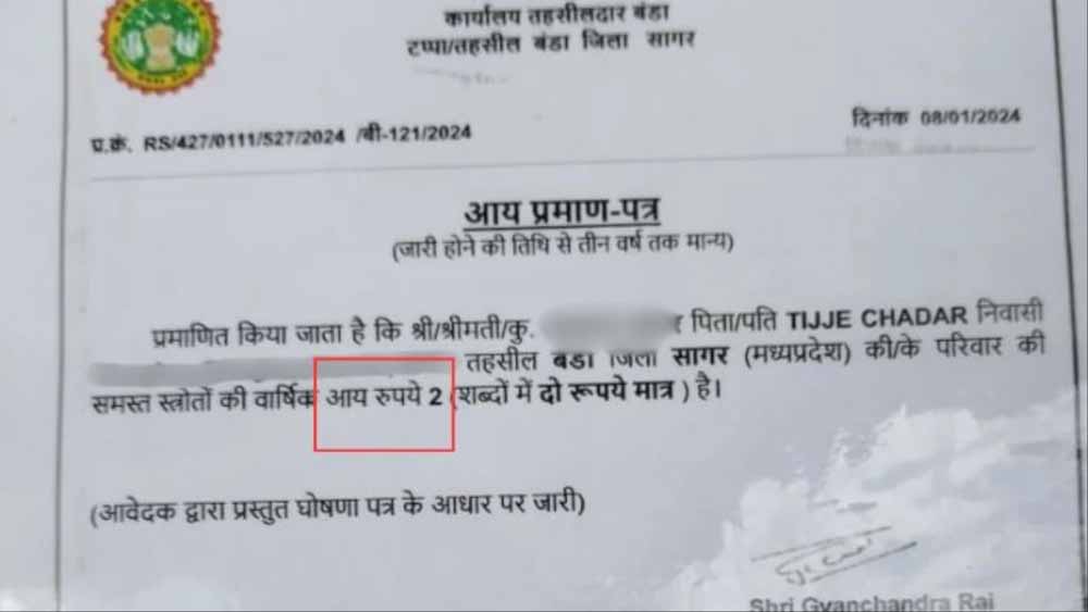 सागर के बंडा तहसील में आय प्रमाणपत्र जारी करते समय भारी लापरवाही, 2 रुपए की वार्षिक आय वाला सर्टिफिकेट वायरल