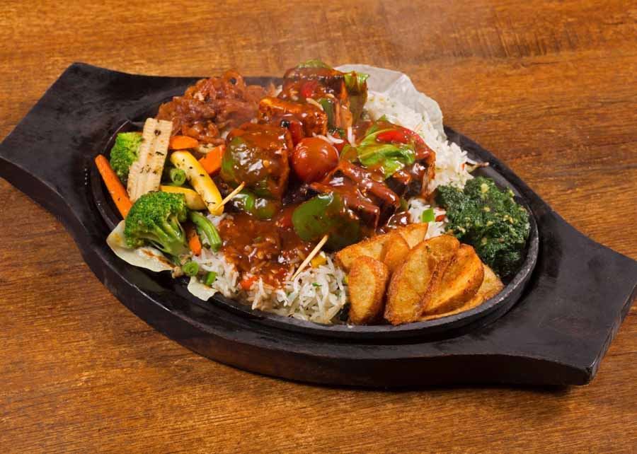 पैन में 2 छोटे चम्मच तेल गरम करें, प्याज, बेबीकार्न, मशरूम, शिमला मिर्चें चैकोर टुकड़ों में काटें। इन्हें पैन में डाल कर चमकदार होने तक भूनें। 1−1 चम्मच अदरक लहसुन पेस्ट एवं मिर्च पेस्ट डाल कर कुछ देर भूनें। टमाटर और आलू छोटे टुकड़ों में काट कर डालें। टमाटर का रस सूखने तक भूनें। ग्रिल को 1 मिनट तक गरम करके पनीर रोस्ट कर लें। ओवन न होने पर तवे पर तेल गरम करके पनीर के टुकड़े सुनहरा होने तक भून लें। सिजलर ट्रे को गरम कर लें। चिमटे की सहायता से उठा कर लकड़ी की ट्रे पर रखें। बंद गोभी के गरम पानी में भीगे पत्ते निकाल कर ट्रे पर बिछाएं। बीच में सब्जियां पलट कर आसपास पनीर सजाएं। 2 छोटे चम्मच पिघला मक्खन चारों ओर डालें। भाप के साथ गरम−गरम सर्व करें।