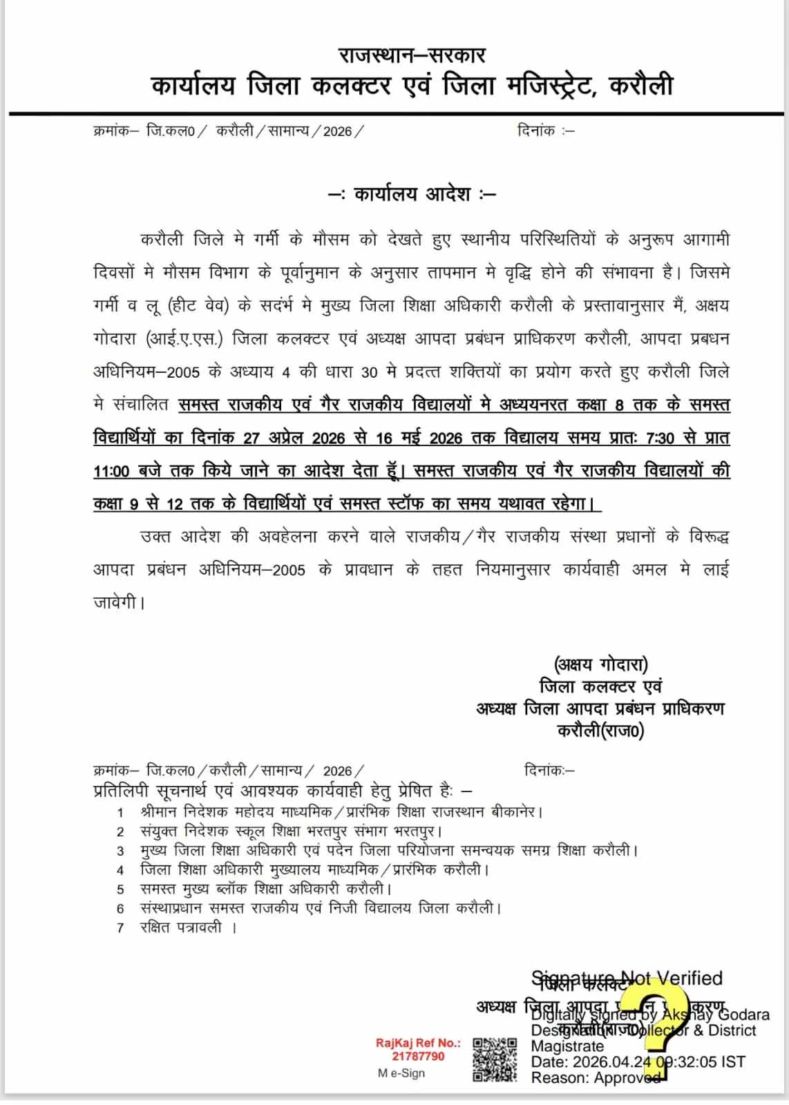 करौली में बढ़ती गर्मी और हीटवेव के खतरे को देखते हुए जिला प्रशासन ने बड़ा फैसला लिया है. जिला कलेक्टर अक्षय गोदारा ने आदेश जारी कर सभी सरकारी और प्राइवेट स्‍कूलों में कक्षा 1 से 8 तक के विद्यार्थियों के लिए स्कूल समय में बदलाव किया है. यह आदेश 27 अप्रैल 2026 से 16 मई 2026 तक प्रभावी रहेगा. प्रशासन का कहना है कि यह निर्णय बच्चों के स्वास्थ्य और सुरक्षा को ध्यान में रखते हुए लिया गया है.