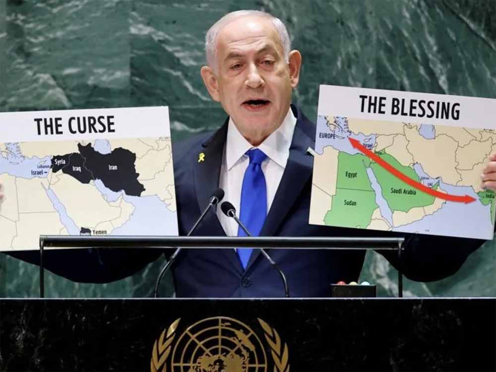 इजरायल के प्रधानमंत्री नेतन्याहू ने यूएन महासभा में जोरदार तरीके से अपनी बात रखी, दिखाए वरदान और श्राप के नक्शे