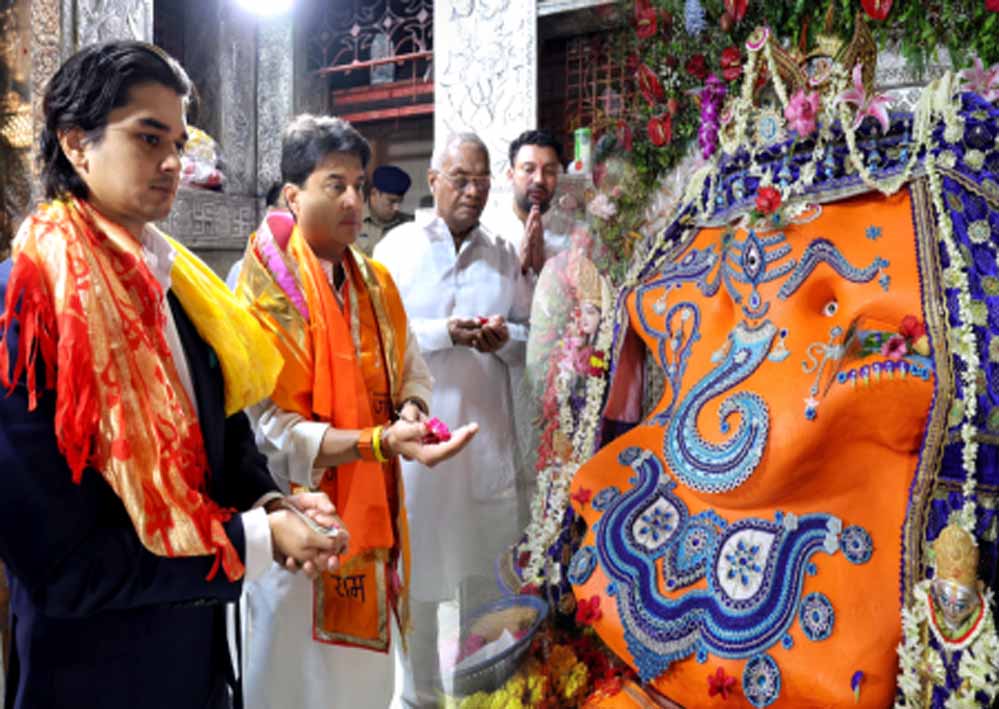 केंद्रीय मंत्री ज्योतिरादित्य सिंधिया मंगलवार सुबह एमपीसीए का चेयरमेन चुने जाने से पहले अपने बेटे महाआर्यमन सिंधिया को लेकर मध्य प्रदेश के इंदौर में स्थित देश के प्रसिद्ध खजराना गणेश मंदिर दर्शन करने पहुंचे। प्राचीन खजराना गणेश मंदिर में ज्योतिराज सिंधिया और महाआर्यमन ने भगवान गणेश का आशीर्वाद लिया। मंदिर के पंडितों ने मंत्रोच्चार के साथ विधि विधान से पूजा कराई।