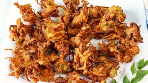 – प्याज के पकोड़े गरमा गरम चाटनी और हरे धनिये के