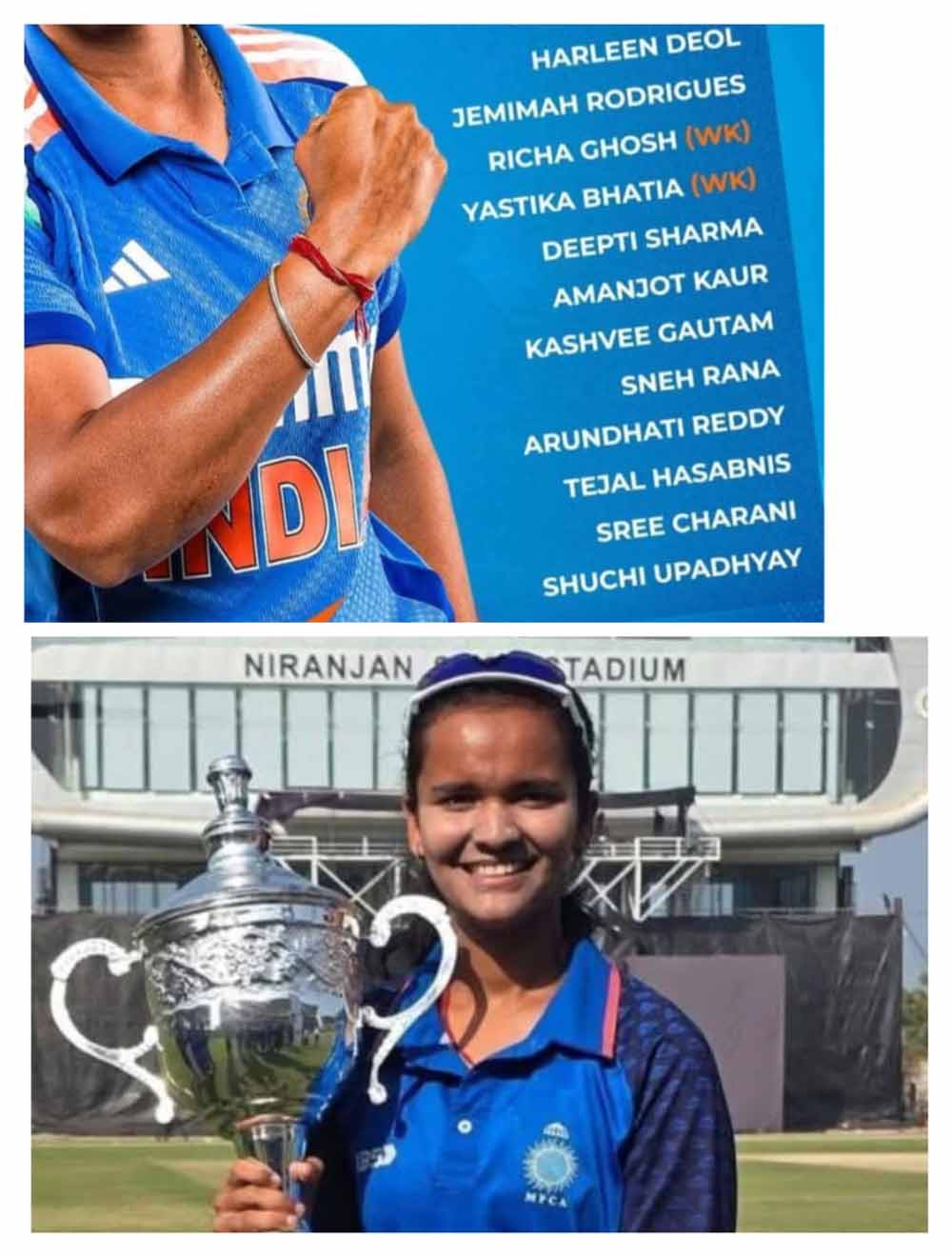 भारतीय क्रिकेट कंट्रोल बोर्ड ने श्रीलंका में होने वाले त्रिकोणीय श्रृंखला के लिए महिला भारतीय क्रिकेट टीम की घोषणा की। 15 सदस्यों की इस टीम में मंडला जिले की क्रिकेट खिलाड़ी शुचि उपाध्याय को शामिल किया गया है। श्रीलंका के कोलम्बो में आयोजित होने वाले इस टूर्नामेंट में शुचि उपाध्याय लेफ्ट आर्म स्पिनर की भूमिका में रहेगी। भारतीय टीम की कप्तान हरमनप्रीत कौर के नेतृत्व में भारतीय टीम 27 अप्रैल से 7 मई तक यह टूर्नामेंट कोलम्बो में खेलेगी। विदित हो शुचि उपाध्याय इन दिनों देहरादून में नेशनल चैलेंजर ट्रॉफी खेल रही हैं। इसके पूर्व नेशनल सीनियर वुमेन टूर्नामेंट में सर्वाधिक विकेट प्राप्त करने पर प्लेयर ऑफ सीरीज रह चुकी हैं।