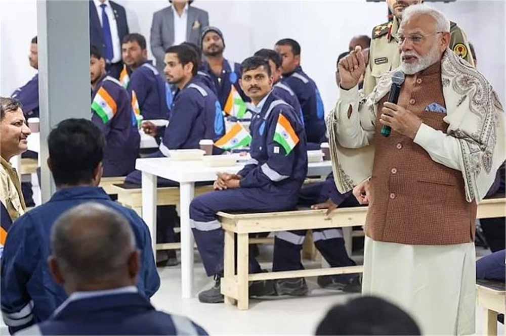 कुवैत में प्रधानमंत्री नरेंद्र मोदी ने गल्फ स्पिक लेबर कैंप का दौरा किया, जहां उन्होंने भारतीय कामगारों से मुलाकात की। PM मोदी ने बातचीत के दौरान कहा, "जब मैं साल 2047 के विकसित भारत की बात करता हूं, तो मैं ये इसलिए करता हूं क्योंकि मेरे भारतीय भाई, जो अपने घरों से दूर यहां काम कर रहे हैं, भी ये सपना देखते हैं कि उनके गांव में अंतरराष्ट्रीय हवाई अड्डा बने। उनकी महत्वाकांक्षा ही भारत की ताकत है।" उन्होंने कहा, "मेरे देश के किसान और मजदूर बहुत मेहनत करते हैं। अगर वे 10 घंटे काम कर सकते हैं, तो मुझे 11 घंटे काम करना चाहिए। अगर वे 11 घंटे काम करते हैं, तो मुझे 12 घंटे काम करना चाहिए। आप अपने परिवार के लिए मेहनत करते हैं, और मैं अपने 140 करोड़ देशवासियों के परिवार के लिए मेहनत करता हूं।"