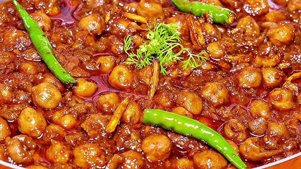 ढाबा-स्टाइल, चटपटे और स्वादिष्ट मसालेदार छोले तैयार हैं।