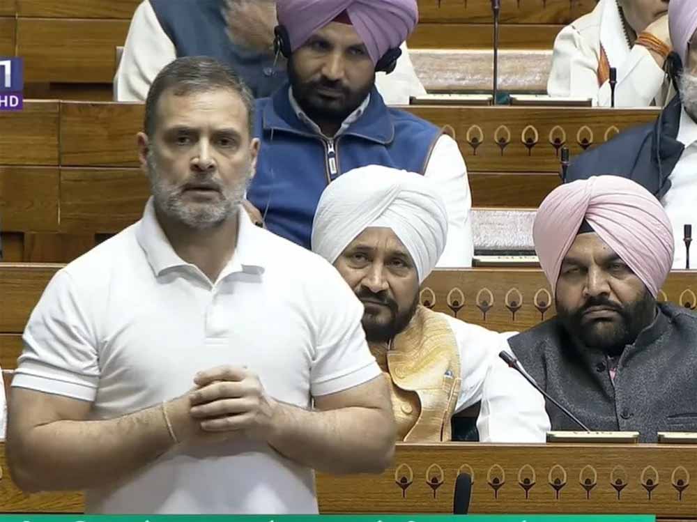 लोकसभा में विपक्ष के नेता राहुल गांधी ने भारत के संविधान को "भारत माता" का दस्तावेज बताया। उन्होंने कहा, "संविधान आधुनिक भारत का दस्तावेज है, लेकिन इसे प्राचीन भारत और उसके विचारों के बिना कभी नहीं लिखा जा सकता था।" राहुल गांधी ने कहा कि विपक्ष में संविधान को बचाने की बात करने वाले लोग बैठे हैं। इस दौरान उन्होंने सत्ताधारी भारतीय जनता पार्टी (भाजपा) पर निशाना साधा। उन्होंने कहा कि सावरकर ने संविधान के खिलाफ बोला था। राहुल गांधी ने एकलव्य का किस्सा सुनाते हुए कहा कि "आप (भाजपा) गरीबों का, पूरे देश का अंगूठा काट रहे हो।" लोकसभा में नेता प्रतिपक्ष राहुल गांधी ने शनिवार को लोकसभा में सरकार पर तीखा प्रहार किया और आरोप लगाया कि जिस तरह एकलव्य का अंगूठा काटा गया उसी तरह से आज सरकार देश के युवाओं का अंगूठा काट रही है। उन्होंने ‘संविधान की 75 वर्ष की गौरवशाली यात्रा’ पर चर्चा में भाग लेते हुए कहा कि आज भारत में एक वैचारिक लड़ाई चल रही है और विपक्ष की तरफ संविधान के विचारों के संरक्षक हैं। राहुल गांधी ने कहा कि द्रोणाचर्य और एकलव्य की गाथा का उल्लेख करते हुए कहा कि जैसे एकलव्य का अंगूठा काटा गया, उसी तरह सरकार पूरे देश आप पूरे देश का युवाओं का अंगूठा काट रही है।