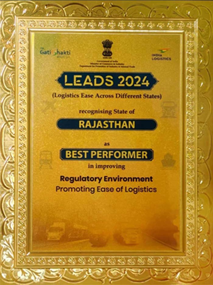 राजस्थान को LEADS 2024 रिपोर्ट में लॉजिस्टिक्स क्षेत्र में सुगमता को प्रोत्साहित करने और राज्य में लॉजिस्टिक्स क्षेत्र में नियामक वातावरण में सुधार के लिए यह अवार्ड दिया गया है। यह रिपोर्ट केंद्रीय वाणिज्य एवं उद्योग मंत्री पीयूष गोयल द्वारा जारी की गई है। चार कैटेगिरी में से एक में यह अवार्ड राजस्थान को दिया गया है।