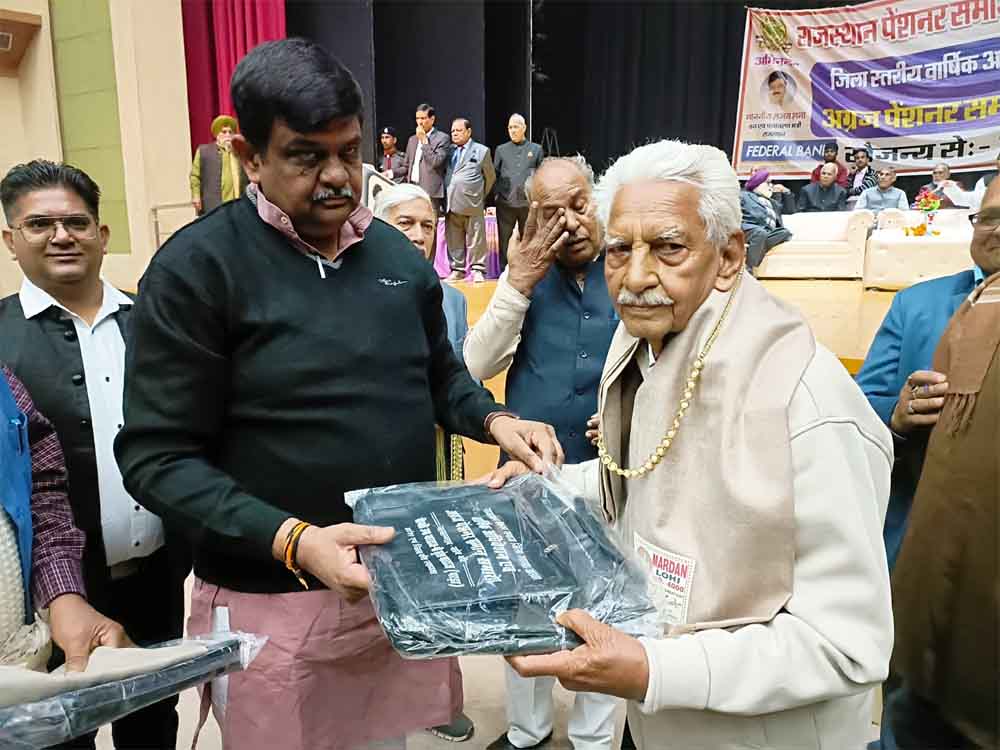 उन्होंने पेंशनर समाज को साधुवाद देते हुए कहा कि पेंशनर समाज द्वारा निरन्तर सामाजिक सरोकार के कार्य किए जा रहे हैं। उन्होंने कहा कि पेंशनर्स अनुभवी व्यक्ति होते हैं अतः केंद्र व राज्य सरकार की जनकल्याणकारी योजनाओं के बारे में अपने आसपास के लोगों को जागरूक कर योजनाओं से लाभांवित कराने में सहयोग करें। उन्होंने कहा कि पेंशनर समाज की सभी न्यायोचित मांगों को राज्य सरकार स्तर से पूरा कराने का सकारात्मक प्रयास करेंगे। उन्होंने कहा कि सामाजिक सुरक्षा योजनाओं का लाभ वरिष्ठजनों को देने के लिए सरकार पूर्ण रूप से प्रतिबद्ध है। उन्होंने कहा कि राज्य सरकार द्वारा वरिष्ठ नागरिकों को सामाजिक सुरक्षा योजना के तहत मिलने वाले पेंशन लाभ को बढाकर 1150 रूपये किया है  ताकि वे किसी अन्य पर आश्रित न रहकर अपना जीवन स्वाभिमान के साथ व्यतीत कर सकें। उन्होंने कहा कि सरकार द्वारा तीर्थयात्रा योजना के तहत बडी संख्या में वरिष्ठ नागरिकों को भारत के प्रमुख धार्मिक स्थलों की बस, रेल व हवाई जहाज के माध्यम से यात्रा कराई गई है। इस दौरान उन्होंने स्मारिका का विमोचन किया। कार्यक्रम में 90 वर्ष से अधिक के 21 व्यक्तियों एवं 75 वर्ष से अधिक के 111 व्यक्तियों का माला पहनाकर व शॉल ओढाकर तथा बैग प्रदान कर सम्मान किया। पेंनशर समाज के जिला अध्यक्ष श्री मधुसूदन शर्मा ने पेंशनर समाज द्वारा की गई गतिविधियों के बारे में अवगत कराया। उन्होंने अतिथियों का आभार जताया। इस अवसर पर पेंशनर समाज के पदाधिकारी एवं बडी संख्या में पेंशनर्स व उनके परिजन मौजूद रहे।