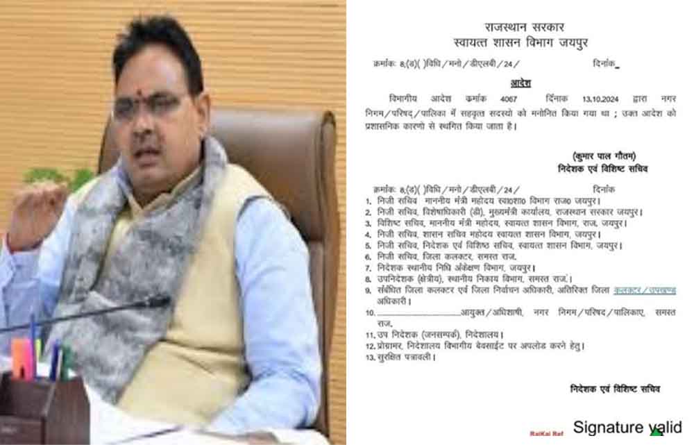 प्रदेश की भजनलाल सरकार ने रविवार को सरकार ने स्थानीय निकायों में मनोनीत सदस्यों की अधिसूचना जारी की थी, लेकिन नव निर्वाचित सदस्यों को बधाई मिलने से पहले ही स्थगन आदेश जारी कर दिए गए।रविवार को प्रदेश की भजनलाल सरकार ने स्थानीय निकायों में मनोनीत सदस्यों की नियुक्ति की अधिसूचना जारी की थी। आदेश स्थगित कर दिया।