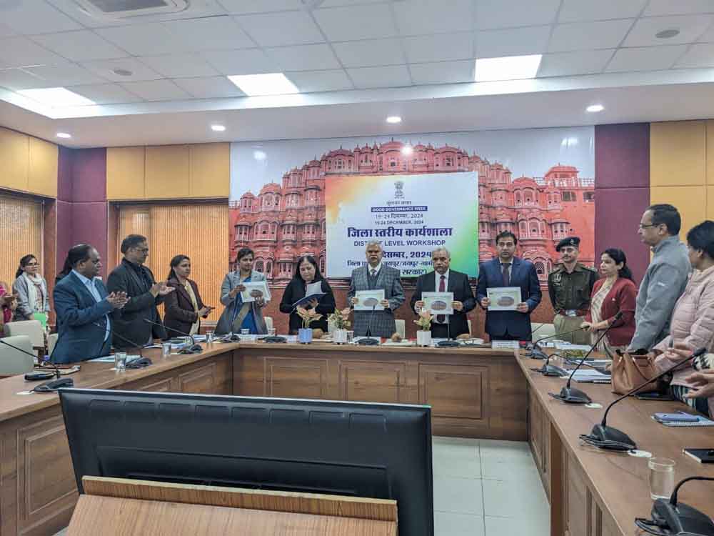 जिला कलक्टर डॉ. जितेन्द्र कुमार सोनी की अध्यक्षता में आयोजित कार्यशाला में रास्ता खोलो अभियान, नशा मुक्त जयपुर अभियान, सक्षम जयपुर अभियान एवं ज्ञानधरा अभियान सहित जयपुर जिला प्रशासन द्वारा सुशासन की दिशा में संचालित नवाचारों की विस्तृत जानकारी प्रदान की गई। कार्यशाला में सुशासन सप्ताह के तहत समस्त विभागों के जिला स्तरीय कार्यालयों द्वारा तैयार जिला-जयपुर, जयपुर ग्रामीण एवं दूदू का विजन डॉक्यूमेंट- 2047 का विमोचन किया गया। इस दौरान जिला सूचना एवं जनसंपर्क कार्यालय द्वारा तैयार की गई 'सुशासन की दिशा में जयपुर जिला प्रशासन के प्रयास' वीडियो फिल्म का प्रसारण किया गया। कार्यशाला को संबोधित करते हुए वक्ताओं ने सुशासन के जरिये समाज के अंतिम तबके तक सरकार की जनकल्याणकारी योजनाओं की जानकारी एवं लाभ पहुंचाने की की जरूरत पर बल दिया। जिला परिषद की मुख्य कार्यकारी अधिकारी श्रीमती प्रतिभा वर्मा ने बताया कि सुशासन सप्ताह के दौरान जिला स्तरीय जनसुनवाई आयोजित की गई। प्रशासन गांवों की ओर अभियान, सुशासन सप्ताह शिविर, रन फॉर विकसित राजस्थान कार्यक्रम, आदि के बारे में भी बताया गया। युवाओं के लिए मानसिक स्वास्थ्य जागरूकता कार्यक्रम, कौशल विकास एवं उद्यमिता कार्यक्रम सहित विभिन्न कार्यक्रमों की जानकारी दी गई। कार्यशाला में अतिरिक्त जिला कलक्टर (द्वितीय) श्री आशीष कुमार, अतिरिक्त जिला कलक्टर (तृतीय) श्रीमती कुंतल विश्नोई, अतिरिक्त जिला कलक्टर (चतुर्थ) श्रीमती सुमन पंवार, अतिरिक्त जिला कलक्टर (पूर्व) श्री देवेन्द्र कुमार जैन, जिला परिषद के अतिरिक्त मुख्य कार्यकारी अधिकारी श्री शेर सिंह लुहाड़िया सहित अन्य विभागों के जिला स्तरीय अधिकारी एवं स्कूल एवं कॉलेज के विद्यार्थी मौजूद रहे।