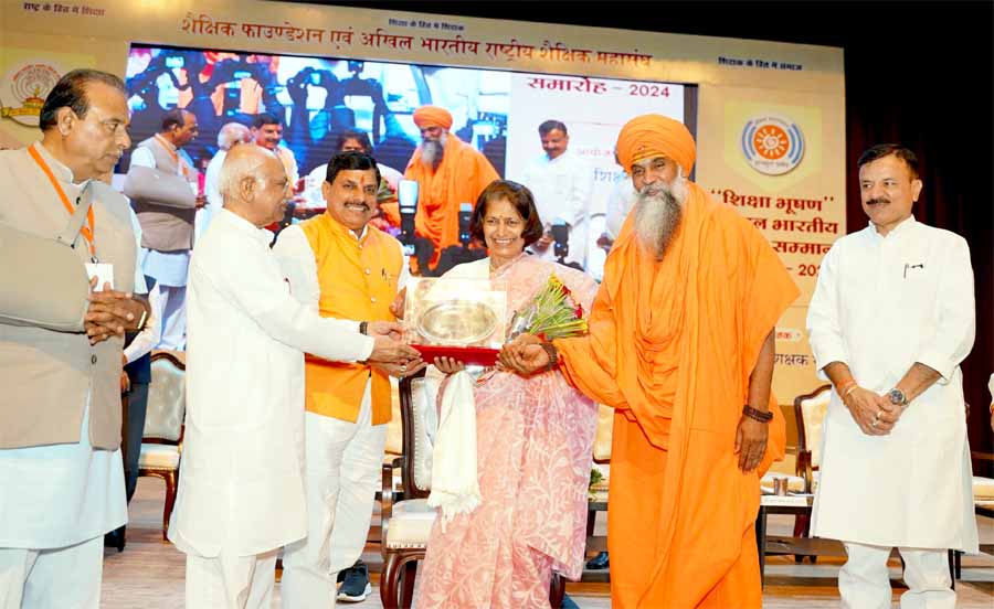 मध्यप्रदेश की राजधानी भोपाल रवींद्र भवन में “शिक्षा भूषण” अखिल भारतीय शिक्षक सम्मान समारोह में 3 महानुभावों को सम्मानित किया गया। कार्यक्रम में प्रोफेसर कुसुमलता केडिया, डॉ रामचंद्रन आर और प्रोफेसर के के अग्रवाल को शिक्षा भूषण सम्मान से सम्मानित किया गया। तीनों शिक्षकों को शॉल, श्रीफल, एक लाख रुपए का चेक, सिल्वर प्लेट और प्रशस्ति पत्र देकर सम्मानित किया।