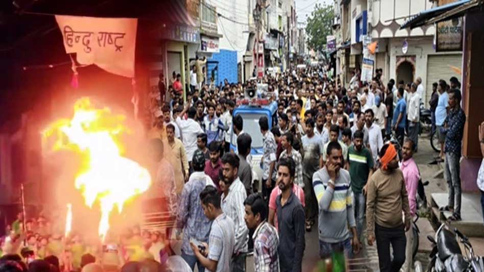 मोहर्रम के जुलूस के दौरान सोशल मीडिया पर वायरल हुए वीडियो से रतलाम जिले के सैलाना में तनाव की स्थिति पैदा हो गई। सोमवार सुबह हिंदू संगठनों ने विरोध जताते हुए नगर के बाजार बंद करवा दिए। लोग चौराहे पर बैठकर सुंदरकांड पाठ करते हुए आरोपितों पर कार्रवाई की मांग कर रहे हैं। एसडीओपी नीलम बघेल, थाना प्रभारी सुरेंद्र गडरिया समेत पुलिस बल मौके पर मौजूद हैं।