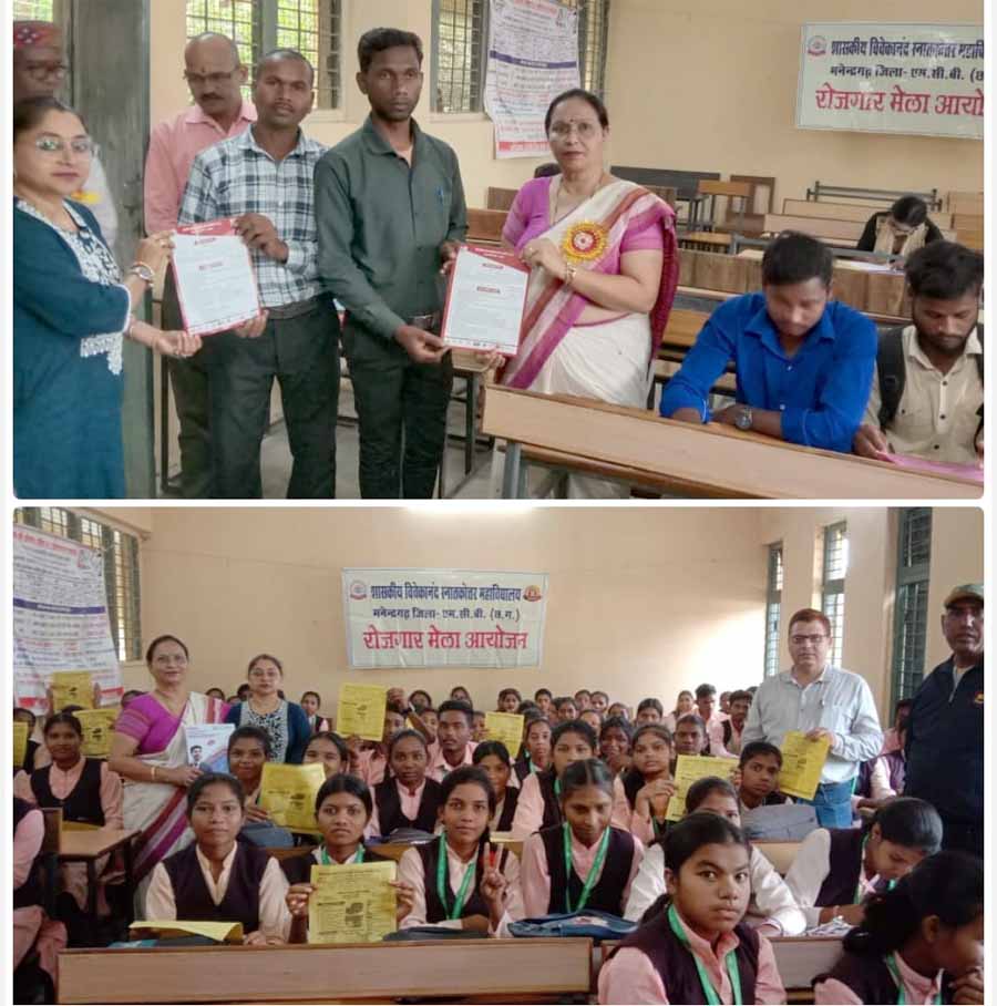 अग्रणी महाविद्यालय शासकीय विवेकानंद स्नातकोत्तर महाविद्यालय मनेद्रगढ़ में परियोजना निदेशक नितेश कुमार उपाध्याय जिला ग्रामीण विकास प्रशासन योजना, जिला-मनेन्द्रगढ़-चिरमिरी-भरतपुर (छ.ग.) के नेतृत्व में एवं प्राचार्य डॉ. सरोजबाला श्याग विश्नोई के संरक्षण एवं मार्गदर्शन में महाविद्यालय में जिला स्तरीय विशेष रोजगार मेले का आयोजन किया गया, जिसमें एस.आई.एस. ग्रुप इंटरप्राइजेश के भर्ती अधिकारी उपस्थित हुए जिले के उपस्थित बेरोजगारों को संबोधित करते हुए प्राचार्य डॉ. विश्नोई ने बताया कि सुरक्षा के क्षेत्र में अपना करियर बनाने के इच्छुक युवाओं के लिए यह सुनहरा अवसर है। जिनकी आयु 19 वर्ष से 40 वर्ष के बीच है वे सभी इस रोजगार मेले का लाभ ले सकते है।