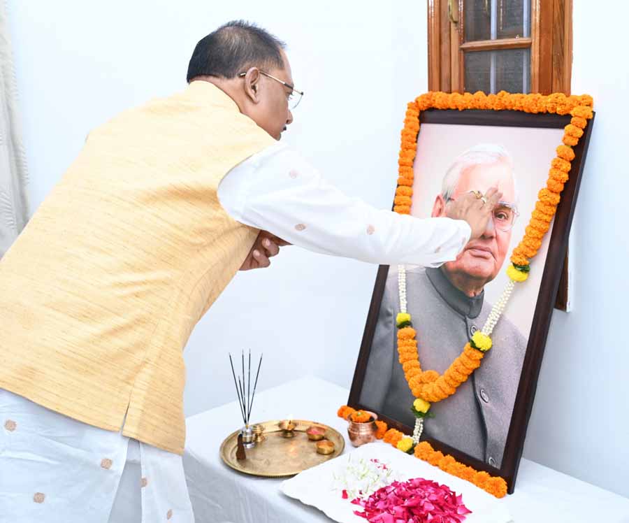 मुख्यमंत्री श्री विष्णु देव साय ने आज यहां अपने निवास में पूर्व प्रधानमंत्री भारत रत्न  श्रद्धेय स्वर्गीय श्री अटल बिहारी वाजपेयी की पुण्यतिथि के अवसर पर उनके छायाचित्र पर माल्यार्पण कर उन्हें नमन किया। इस मौके पर डॉ. रामप्रताप सिंह भी मौजूद रहे।