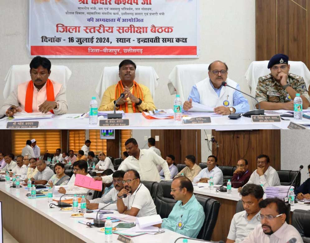 मंत्री श्री कश्यप ने कहा कि मुख्यमंत्री श्री विष्णु देव साय के नेतृत्व में राज्य सरकार किसानों की उन्नति के लिए संवेदनशीलता के साथ कार्य कर ही है। शासन द्वारा किसान हितैषी योजनाओं का क्रियान्वयन की जा रही है। उन्होंने कहा कि किसानों के सहूलियत को ध्यान में रखते हुए उनके मांग के अनुरूप खाद और बीज उपलब्ध कराना सुनिश्चित करें। उन्होंने किसानों को खेती-किसानी के संबंध में जरूरी पहलुओं की जानकारी कृषि विभाग के अधिकारी तथा कृषि विज्ञान केन्द्र के माध्यम से प्रदान करने के निर्देश दिए। मंत्री श्री कश्यप ने केन्द्र एवं राज्य शासन की महत्वाकांक्षी योजना-प्रधानमंत्री आवास योजना, सामुदायिक एवं व्यक्तिगत शौचालय निर्माण, महतारी वंदन योजना, प्रधानमंत्री किसान सम्मान निधि, नियद नेल्लानार की प्रगति की समीक्षा की। कलेक्टर श्री अनुराग पाण्डेय ने जिले में सिंचाई का रकबा बढ़ाने, नियद नेल्लानार की प्रगति, बीजापुर के शांति नगर वार्ड में निवासरत नक्सल पीड़ित परिवारों दी जा रही आवश्यक सुविधाएं, रेल कॉरिडोर संबंधी प्रस्ताव आदि के संबंध में विस्तृत जानकारी दी। बैठक में पुलिस अधीक्षक डॉ. जितेन्द्र यादव, सीईओ जिला पंचायत श्री हेमंत रमेश नंदनवार, डीएफओ श्री रामाकृष्ण, उप निदेशक इन्द्रावती टाईगर रिजर्व श्री संदीप बल्गा सहित जिला स्तरीय वरिष्ठ अधिकारी उपस्थित थे।