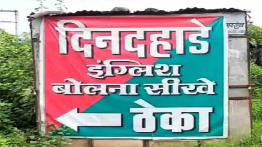 पोस्टर पर लिखा है, 'दिनदहाड़े इंग्लिश बोलना सीखें…'। इसके साथ ही एक तीर शराब की दुकान की ओर इशारा कर रहा है। इस पोस्टर को देखकर लोग हैरान रह गए और सोशल मीडिया पर इसकी जमकर आलोचना हो रही है। लोग इसे शराब की दुकान को आकर्षक बनाने की एक घटिया कोशिश बता रहे हैं।