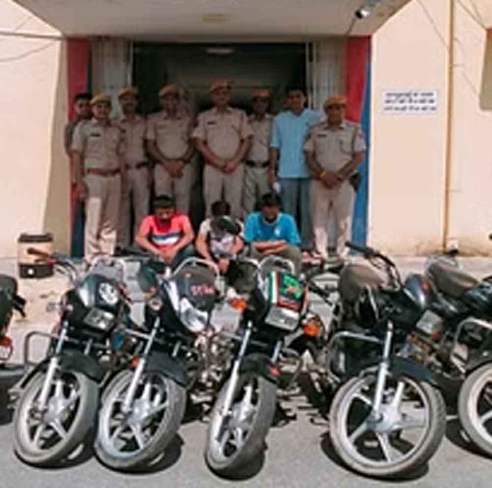इसी दौरान तीन युवक संदिग्ध अवस्था में मिले, जिनसे मोटर साइकिल के दस्तावेज मांगे गए तो वे कोई संतोषप्रद जवाब नहीं दे सके। तीनों युवकों से जब गहनता से पूछताछ की गई तो उन्होंने मोटर साइकिल शहर के सुभाष उद्यान से चोरी करना कबूल किया, जिस पर पुलिस ने मामला दर्ज करते हुए नंदकिशोर पंवार पुत्र खेमचंद पंवार, जीतू पुत्र घनश्याम खटीक व किशनसिंह पुत्र नाहर सिंह राजपूत को गिरफ्तार किया है। पुलिस पूछताछ में आरोपियों ने शहर के विभिन्न स्थानों से मोटर साइकिल चुराना कबूल किया है। पुलिस ने आरोपियों के कब्जे से चोरी की 10 मोटर साइकिलें बरामद की हैं, फिलहाल पुलिस मामले की जांच में जुटी है।
