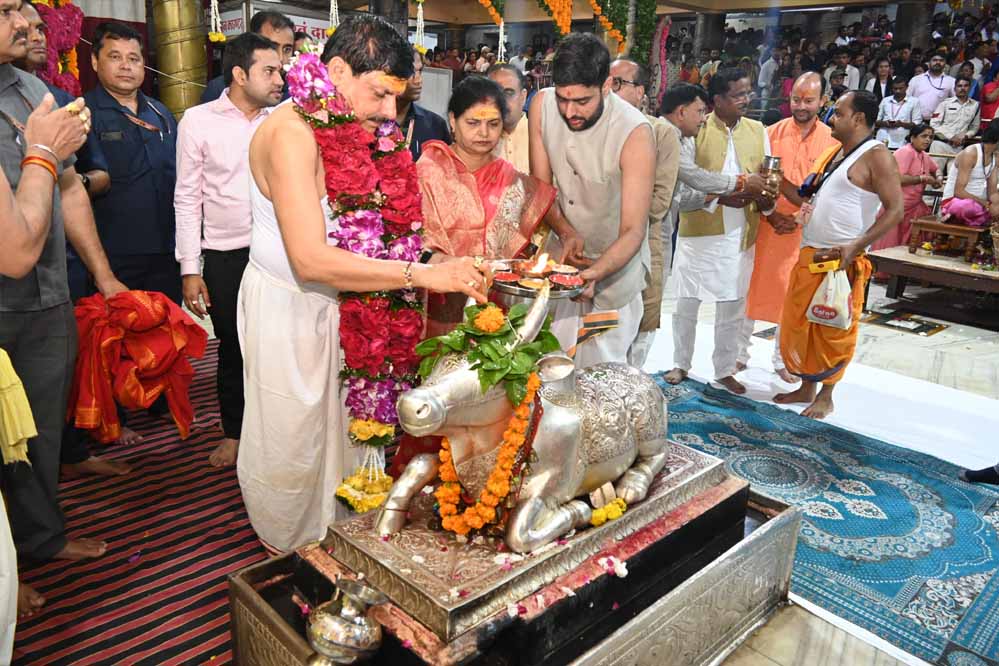 मुख्यमंत्री डॉ. मोहन यादव ने सोमवार को सोमवती अमावस्या पर भगवान महाकालेश्वर के मंदिर में पहुंचकर भगवान महाकालेश्वर के दर्शन किए और सपत्नीक पूजन अर्चन किया। नंदी हॉल में महाकालेश्वर मंदिर प्रबंध समिति के अध्यक्ष और कलेक्टर नीरज कुमार सिंह, प्रशासक गणेश कुमार धाकड़ ने मुख्यमंत्री डॉ यादव को शाल, प्रसाद और भगवान श्री महाकालेश्वर का चित्र भेंटकर सम्मान किया।