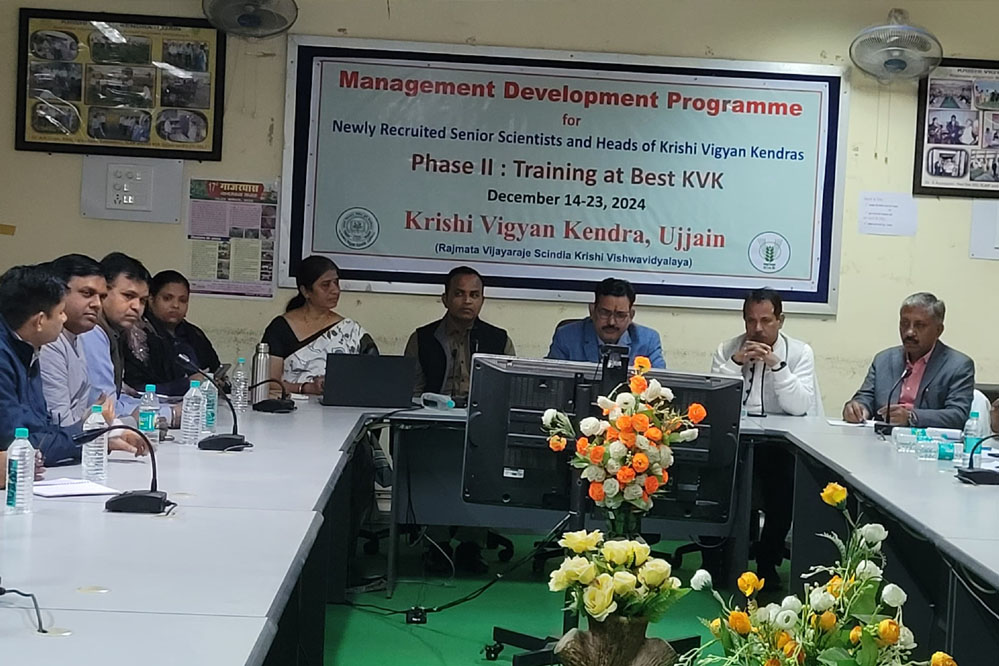 भारतीय कृषि अनुसंधान परिषद, नई दिल्ली द्वारा विभिन्न कृषि विज्ञान केन्द्रों के नवनियुक्त वरिष्ठ वैज्ञानिक एवं प्रमुख को प्रथम चरण अंतर्गत नार्म, हैदराबाद में प्रशिक्षण उपरांत द्वितीय चरण: प्रबंध विकास कार्यक्रम, कृषि विज्ञान केन्द्र, उज्जैन का भा.कृ.अनु.प. नई दिल्ली द्वारा सर्वोत्तम संस्था के रूप में चयनित होने पर, पांच प्रदेशों के छः वरिष्ठ वैज्ञानिकों क्रमश: डॉ. व्ही. दामोदरण (अंडमान), डॉ.राजीव सिंह (हमीरपुर, उ.प्र.), डॉ. दुष्यंत के. राघव (मालदा, प.बं.), डॉ.संतोष कुमार (निकोवार द्वीप), डॉ.दीपक राय (कुंठी, झारखंड) तथा डॉ.मानधाता सिंह (देवरिया,उ.प्र.) को संस्था प्रमुख डॉ.ए.के. दीक्षित के सानिध्य में दस दिवसीय 14-23 दिसम्बर 2024 तक विभिन्न पहलुओं जैसे कार्ययोजना तैयार कर किसानों के खेतों पर रणनीत अनुसार लागू करने साथ ही समय-समय पर प्रभावी निरीक्षण, वित्तीय प्रबंधन आदि पहलुओं पर महत्वपूर्ण जानकारी ख्याति प्राप्त विशेषज्ञों द्वारा दी गई।