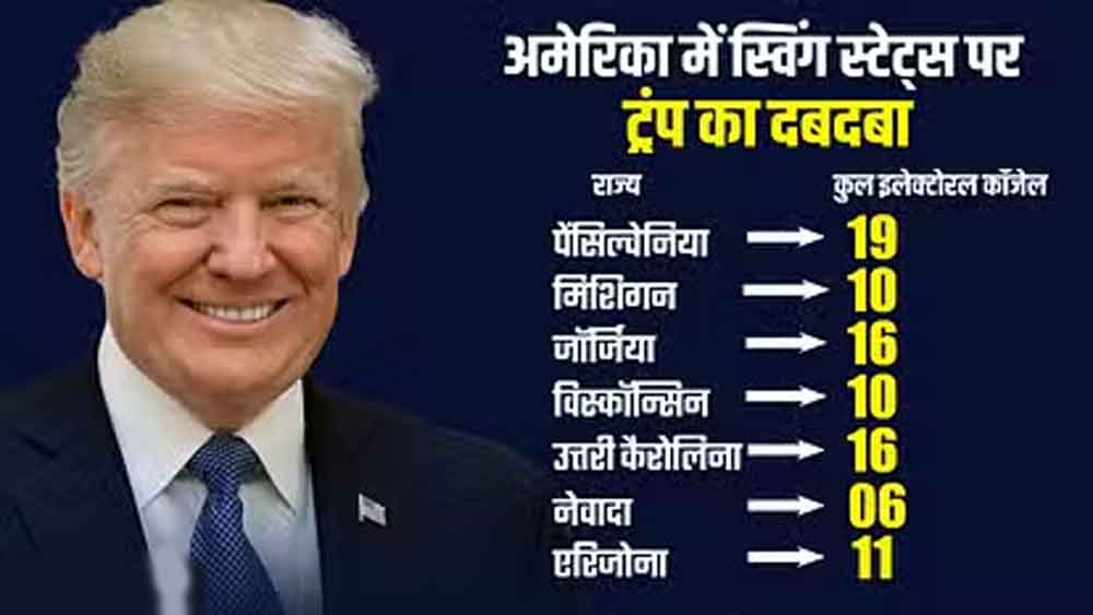 अमेरिका में स्विंग स्टेट उन राज्यों को कहा जाता है, जहां पार्टियों का समर्थन बदलता रहता है। मतलब जहां अमेरिका के कई राज्यों में पहले से विभिन्न सर्वे में पता चल जाता है, कि इन राज्यों में किस पार्टी को जीत मिलेगी, वहीं कुछ राज्यों में बेहद कड़ा मुकाबला होता है और वहां किसी भी पार्टी का पलड़ा भारी हो सकता है। यही वजह है कि इन राज्यों को स्विंग स्टेट कहा जाता है और राष्ट्रपति चुनाव में किस उम्मीदवार को जीत मिलेगा, उसमें इन स्विंग स्टेट की अहम भूमिका होती है। 2024 के चुनाव में सात स्विंग स्टेट थे जिनमें पेंसिल्वेनिया, मिशिगन, जॉर्जिया, विस्कॉन्सिन, उत्तरी कैरोलिना, नेवादा, एरिजोना का नाम शामिल रहा। अब चुनाव नतीजों में सातों स्विंग स्टेट में ट्रंप का जीतना ऐतिहासिक है।
