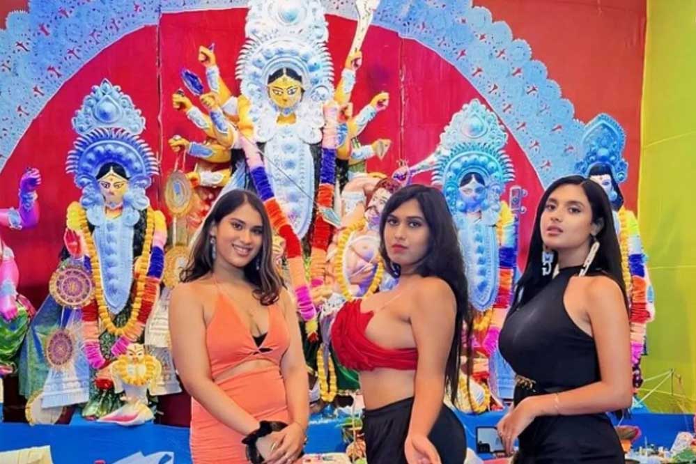 धार्मिक स्थल पर आपत्तिजनक कपड़ों का मामला एक बार फिर सामने आया है। ताजा घटना कोलकाता की है, जहां सोशल मीडिया इंफ्लुएंसर के कपड़ों पर बवाल मच गया। पंडाल में इस तरह जाने के चलते सोशल मीडिया पर जमकर आलोचना हो रही है। खबरें हैं कि तस्वीर में नजर आ रहीं हेमश्री भद्रा साल 2016 में मिस कोलकाता का खिताब भी जीत चुकी हैं।