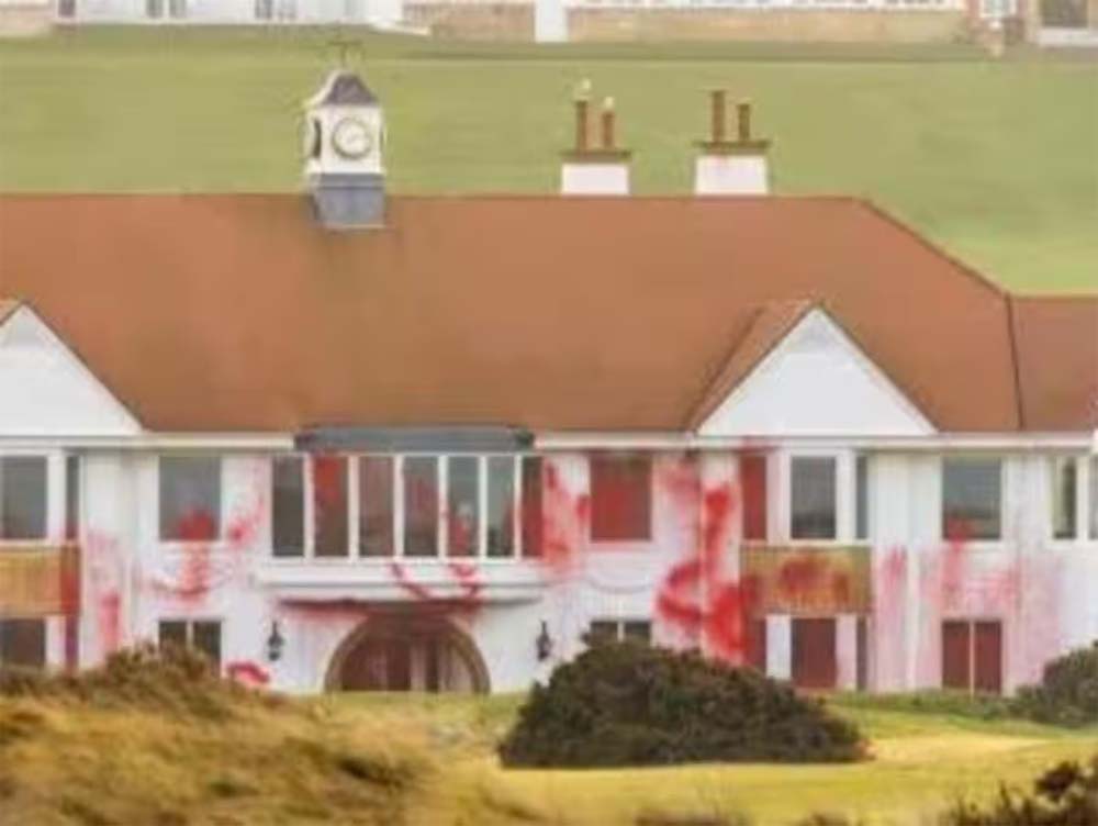 रिपोर्ट के मुताबिक, रिजॉर्ट को शनिवार को निशाना बनाया गया। फिलिस्तीन समर्थकों ने गोल्फ कोर्स पर बड़े-बड़े अक्षरों में 'गाजा बिकाऊ नहीं है' लिख दिया। साथ ही, क्लबहाउस को लाल स्प्रे पेंट से खराब किया गया। ग्रीन्स में से एक को नुकसान पहुंचाया, जिसमें ओपन चैंपियनशिप में इस्तेमाल होने वाला होल भी शामिल है। इसकी तस्वीरें सामने आई हैं और सोशल मीडिया पर वायरल हो रही हैं। इंटरनेट यूजर्स ने इस पर तरह-तरह की प्रतिक्रियाएं दी हैं।
