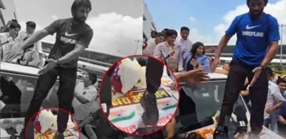 भारत की महिला पहलवान विनेश फोगाट के रोड शो में पहलवान बजरंग पुनिया से बड़ी गलती हो गई। उन्होंने राष्ट्रीय ध्वज तिरंगे के पोस्टर पर अपना जूता रख दिया। उनका यह वीडियो वारयल हो गया, जिससे लोग भड़क गए। उनकी सोशल मीडिया पर काफी आलोचना हो रही है। विनेश के स्वागत के लिए बजंरग और साक्षी कार से पहुंचे थे। यह कार पूरी तरह से सजी हुई थी, जिस पर तिरंगे का पोस्टर भी था। विनेश की बाइट लेने के लिए मीडिया की भीड़ भी थी, जिसको हटाने के लिए बजरंग कार के बोनट पर आ गए। इस दौरान उन्होंने तिरंगे के पोस्टर पर अपने पैर रख दिए।