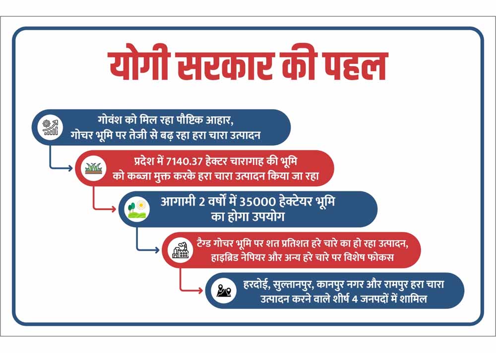 प्रदेश के हरदोई, सुल्तानपुर, कानपुर नगर और रामपुर जनपदों में हरा चारा उत्पादन में उल्लेखनीय वृद्धि दर्ज की गई है। वहीं टैग्ड गोचर भूमि पर शत-प्रतिशत हरा चारा उत्पादन सुनिश्चित किया जा रहा है। गोचर एवं चारागाह भूमि का समतलीकरण, सुरक्षाबाड़ा एवं खाई निर्माण जैसे कार्य मनरेगा कन्वर्जेन्स के माध्यम से कराए जा रहे हैं, जिससे ग्रामीणों को रोजगार भी मिल रहा है और पशुओं के लिए सुरक्षित चारागाह भी विकसित हो रहे हैं।
